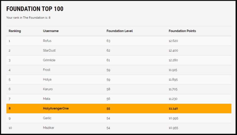 Source: https://fracturedmmo.com/the-foundation/leaderboard/Colour comments: